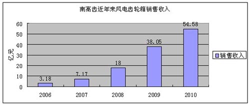 2010年南高齒實現(xiàn)銷售收入73.93億元,較2009年56.47億元增長30.9%。其中風電齒輪箱繼續(xù)保持高速增長態(tài)勢,全年實現(xiàn)銷售 收入54.58億元,較2009年大幅增長43.4%,2009年風電齒輪箱銷售收入為38.05億元。
