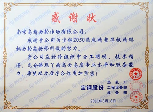 最終,在南高齒生產(chǎn)和技術(shù)部門(mén)的緊密配合下,經(jīng)過(guò)一個(gè)月的緊張搶修,南高齒比寶鋼要求的3月21日,提前一天完成了齒輪箱的修復(fù),受到寶鋼有關(guān)領(lǐng)導(dǎo)部門(mén)的表彰。