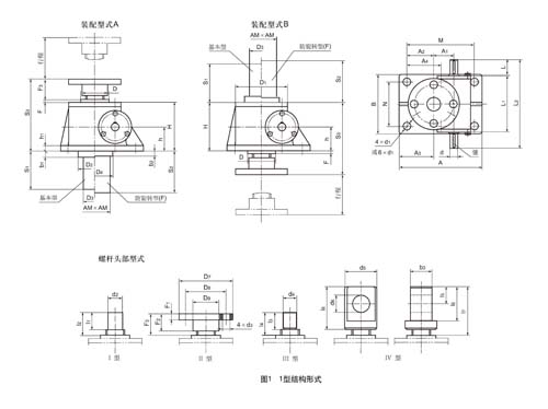 1型結(jié)構(gòu)型式的絲桿頭部分為Ⅰ型(圓柱型)、Ⅱ型(法蘭型)、Ⅲ型(螺紋型)、Ⅳ型(扁頭型)四種型式;