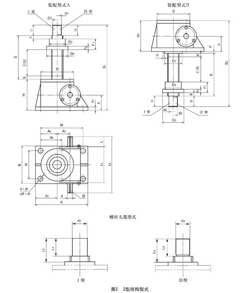 2型結(jié)構(gòu)型式的絲桿頭部分為Ⅰ型(圓柱型)、Ⅲ型(螺紋型)兩種型式。