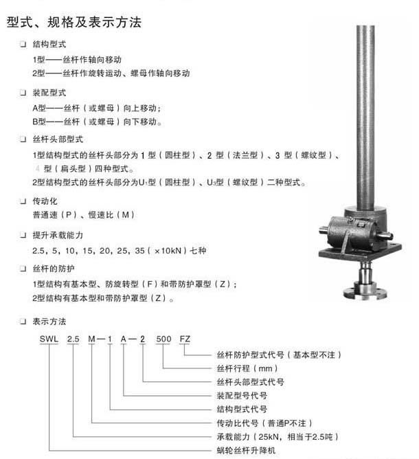 絲杠升降機(jī)廣泛應(yīng)用于機(jī)械、冶金、建筑、水利設(shè)備等行業(yè),具有起升、下降及借助輔件推進(jìn)、翻轉(zhuǎn)及各種高度位置調(diào)整等諸多功能.SWL蝸輪絲杠升降機(jī)是一種基礎(chǔ)起重部件,具有結(jié)構(gòu)緊湊、體積小、重量輕、動力源廣泛、無噪音、安裝方便、使用靈活、功能多、配套形式多、可靠性高、使用壽命長等許多優(yōu)點(diǎn)?梢詥闻_或組合使用,能按一定程序準(zhǔn)確地控制調(diào)整提升或推進(jìn)的高度,可以用電動機(jī)或 其他動力直接帶動,也可以手動。它有不同的結(jié)構(gòu)形式和裝配形式,且提升高度可按用戶的要求定制。 。該裝置可以自鎖
