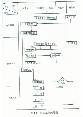 第四步競購。由進(jìn)入競購范圍的供應(yīng)單位或個人向供應(yīng)科提交申報(bào)單,載明:所競購物資名稱、產(chǎn)地、規(guī)格、數(shù)量、質(zhì)量、價(jià)格、交貨期、供應(yīng)渠道、售后服務(wù)等,一式兩份呈報(bào)物管辦和供應(yīng)科公開進(jìn)行競購。供應(yīng)科根據(jù)生產(chǎn)供應(yīng)計(jì)劃和所掌握的最低競價(jià),選定2~3家為供貨單位,報(bào)物管辦備查。最后由供應(yīng)科與供貨單位簽訂合同,具體實(shí)施物資采購進(jìn)廠。 競購成功并簽訂合同的供貨單位須按合同要求,及時、保質(zhì)保量地供貨。若中途違約或物資使用過程中發(fā)現(xiàn)內(nèi)在質(zhì)量問題而造成損失、影響生產(chǎn),則按規(guī)定承擔(dān)違約責(zé)任。凡違約或質(zhì)量問題影響生產(chǎn)兩次以上者,一律取消其競購資格。 全程監(jiān)控 為明確各方面責(zé)任,公司從提出用料申請、編制物資采購計(jì)劃開始,到驗(yàn)收入庫、生產(chǎn)使用為止,制定了詳細(xì)的業(yè)務(wù)流程,所有環(huán)節(jié)一律按工作程序進(jìn)行全程管理。詳見圖4—2采購工作流程圖。 成本管理科將上述流程活動中所涉及的各類信息資料如原輔材料的價(jià)格、質(zhì)量、數(shù)量、供貨單位及聯(lián)系人、責(zé)任人等輸入微機(jī),隨時進(jìn)行查詢、分析、全程追蹤監(jiān)控。