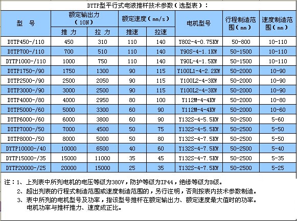 電液推桿主要是由推桿的型式、電機的防護等級、額定輸出力、行程、額定速度和使用角度等六大基本要素組成,還可根據(jù)擁護特殊要求,配套三種調節(jié)功能,即:速度調節(jié)推、拉力調節(jié),行程調節(jié)(行程開關定位)。除上述三種調節(jié)功能定貨時必須文字注明外,其他請參照型號編制方式,認真填寫六大要素。 DYTP型平行式電液推桿技術參數(shù)(選型表)
