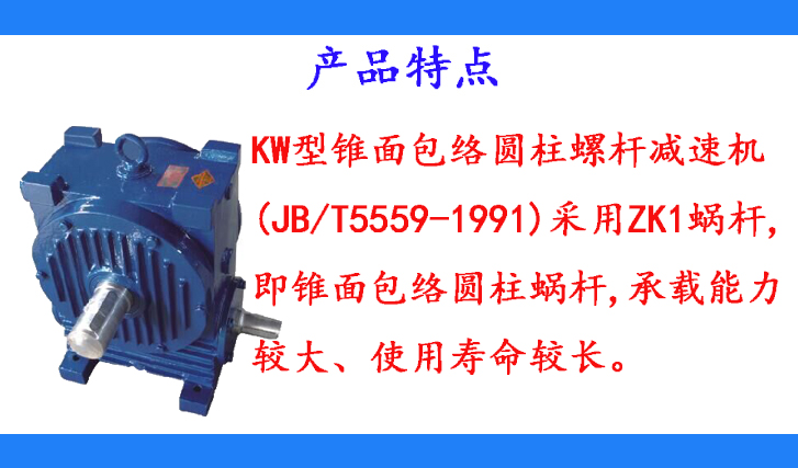 KW型錐面包絡(luò)圓柱螺桿減速機(JB/T5559-1991)采用ZK1蝸桿,即錐面包絡(luò)圓柱蝸桿,承載能力較大、使用壽命較長。