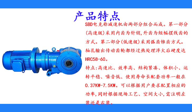 SBD電克稱(chēng)減速機(jī)由兩部分組合而成。第一部分(高速級(jí))采用內(nèi)齒為針?shù)N,外齒為短幅擺線(xiàn)齒的方式。第二部分(低速級(jí))采用弧齒錐齒方式。軸孔輸出傳動(dòng)齒輪都經(jīng)過(guò)熱處理淬火后硬度達(dá)HRC58-60。