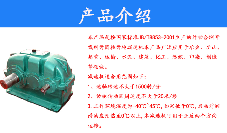 本產(chǎn)品是按國家標準JB/T8853-2001生產(chǎn)的外嚙合漸開線斜齒圓柱齒輪減速機本產(chǎn)品廣泛應(yīng)用于冶金、礦山、起重、運輸、水泥、建筑、化工、紡織、印染、制造等領(lǐng)域。減速機適合用范圍如下:1,速軸轉(zhuǎn)速不大于1500轉(zhuǎn)/分2齒輪傳動圓周速度不大于20米/秒。3.工作環(huán)境溫度為-40℃~45℃,如果低于0℃,啟動前潤滑油應(yīng)預(yù)熱至0℃以上,本減速機可用于正反兩個方向運轉(zhuǎn)