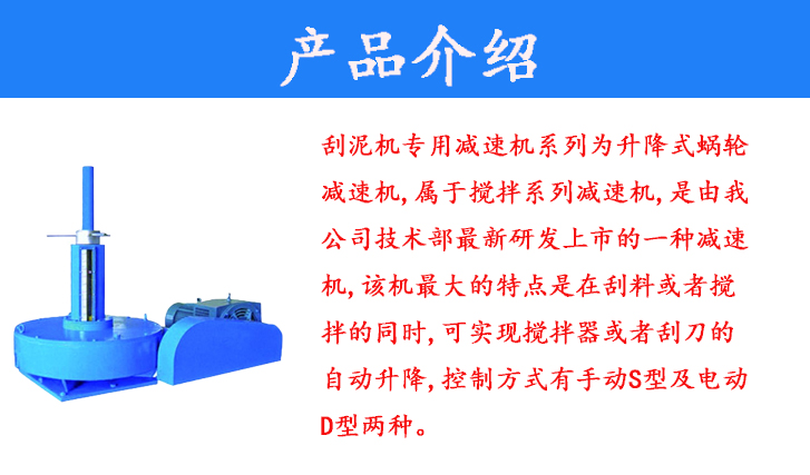 刮泥機(jī)專用減速機(jī)系列為升降式蝸輪減速機(jī),屬于攪拌系列減速機(jī),是由我公司技術(shù)部最新研發(fā)上市的一種減速機(jī),該機(jī)最大的特點(diǎn)是在刮料或者攪拌的同時(shí),可實(shí)現(xiàn)攪拌器或者刮刀的自動(dòng)升降,控制方式有手動(dòng)S型及電動(dòng)D型兩種。