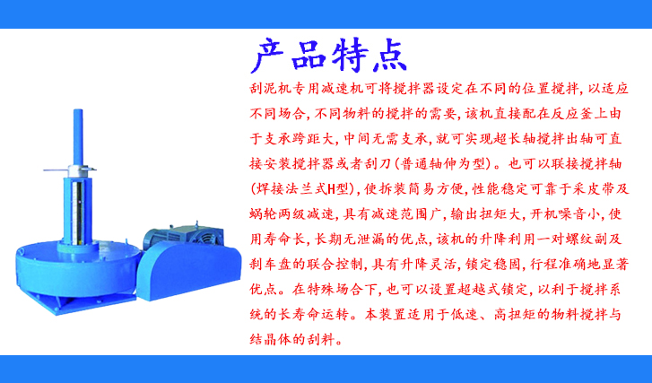 刮泥機(jī)專用減速機(jī)可將攪拌器設(shè)定在不同的位置攪拌,以適應(yīng)不同場(chǎng)合,不同物料的攪拌的需要,該機(jī)直接配在反應(yīng)釜上由于支承跨距大,中間無(wú)需支承,就可實(shí)現(xiàn)超長(zhǎng)軸攪拌出軸可直接安裝攪拌器或者刮刀(普通軸伸為型)。也可以聯(lián)接攪拌軸(焊接法蘭式H型),使拆裝簡(jiǎn)易方便,性能穩(wěn)定可靠于采皮帶及蝸輪兩級(jí)減速,具有減速范圍廣,輸出扭矩大,開(kāi)機(jī)噪音小,使用壽命長(zhǎng),長(zhǎng)期無(wú)泄漏的優(yōu)點(diǎn),該機(jī)的升降利用一對(duì)螺紋副及剎車盤的聯(lián)合控制,具有升降靈活,鎖定穩(wěn)固,行程準(zhǔn)確地顯著優(yōu)點(diǎn)。在特殊場(chǎng)合下,也可以設(shè)置超越式鎖定,以利于攪拌系統(tǒng)的長(zhǎng)壽命運(yùn)轉(zhuǎn)。本裝置適用于低速、高扭矩的物料攪拌與結(jié)晶體的刮料。