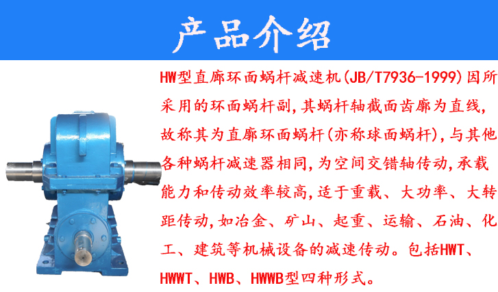 HW型直廊環(huán)面蝸桿減速機(jī)(JB/T7936-1999)因所采用的環(huán)面蝸桿副,其蝸桿軸截面齒廓為直線,故稱(chēng)其為直廓環(huán)面蝸桿(亦稱(chēng)球面蝸桿),與其他各種蝸桿減速器相同,為空間交錯(cuò)軸傳動(dòng),承載能力和傳動(dòng)效率較高,適用于重載、大功率、大轉(zhuǎn)距傳動(dòng),如冶金、礦山、起重、運(yùn)輸、石油、化工、建筑等機(jī)械設(shè)備的減速傳動(dòng)。包括HWT、HWWT、HWB、HWWB型四種形式。