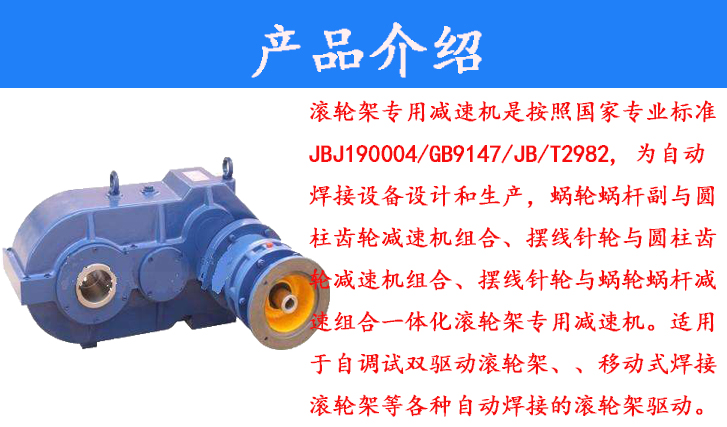 滾輪架專用減速機(jī)是按照國(guó)家專業(yè)標(biāo)準(zhǔn)JB19004/GB9147/JB/T2982,為自動(dòng)焊接設(shè)備設(shè)計(jì)和生產(chǎn)的,蝸輪蝸桿副與圓柱齒輪減速機(jī)組合、擺線針輪與圓柱齒輪減速機(jī)組合,擺線針輪與蝸輪蝸桿減速組合一體化滾輪架專用減速機(jī)。適用于自調(diào)式雙驅(qū)動(dòng)滾輪架、移動(dòng)式焊接滾輪架等各種自動(dòng)焊接的滾輪架驅(qū)動(dòng)。