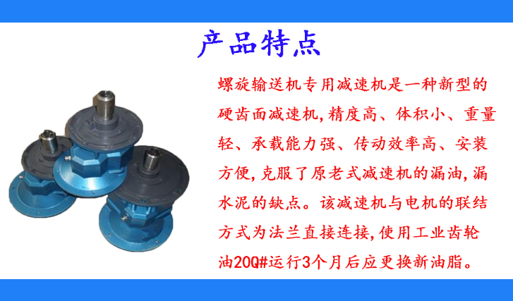 螺旋輸送機(jī)專用減速機(jī)是一種新型的硬齒面減速機(jī),精度高、體積小、重量輕、承載能力強(qiáng)、傳動(dòng)效率高、安裝方便,克服了原老式減速機(jī)的漏油,漏水泥的缺點(diǎn)。該減速機(jī)與電機(jī)的聯(lián)結(jié)方式為法蘭直接連接,使用工業(yè)齒輪油20Q#運(yùn)行3個(gè)月后應(yīng)更換新油脂。