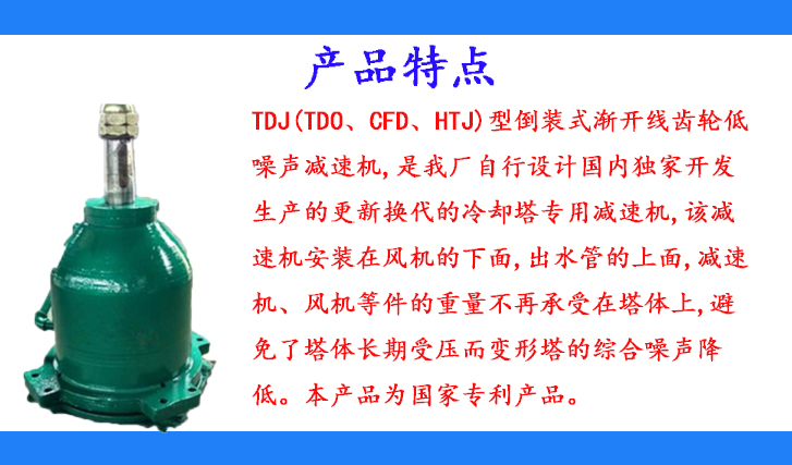 TDJ(TDO、CFD、HTJ)型倒裝式漸開線齒輪低噪聲減速機,是我廠自行設計國內獨家開發(fā)生產的更新換代的冷卻塔專用減速機,該減速機安裝在風機的下面,出水管的上面,減速機、風機等件的重量不再承受在塔體上,避免了塔體長期受壓而變形塔的綜合噪聲降低。本產品為國家專利產品。