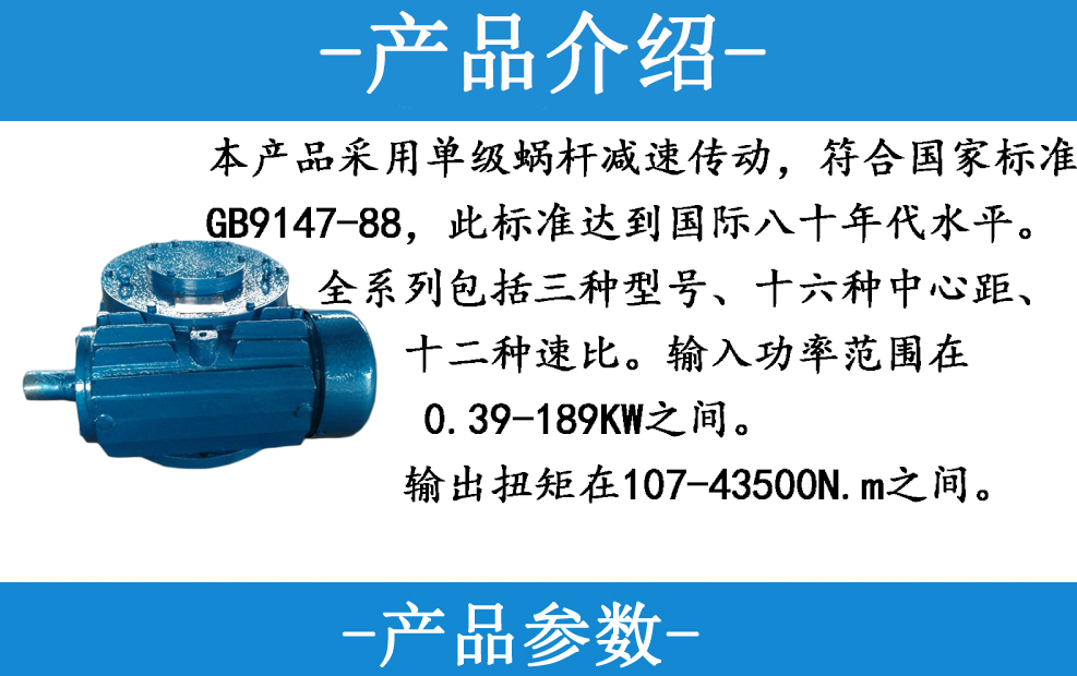 本產(chǎn)品采用單級蝸桿減速傳動(dòng),符合國家標(biāo)準(zhǔn)GB9147-88,此標(biāo)準(zhǔn)達(dá)到國際八十年代水平。全系列包括三種型號(hào)十六種中心距、十二種速比。輸入功率范圍在039-18K之間,輸出扭矩在107-43500Nm之間。