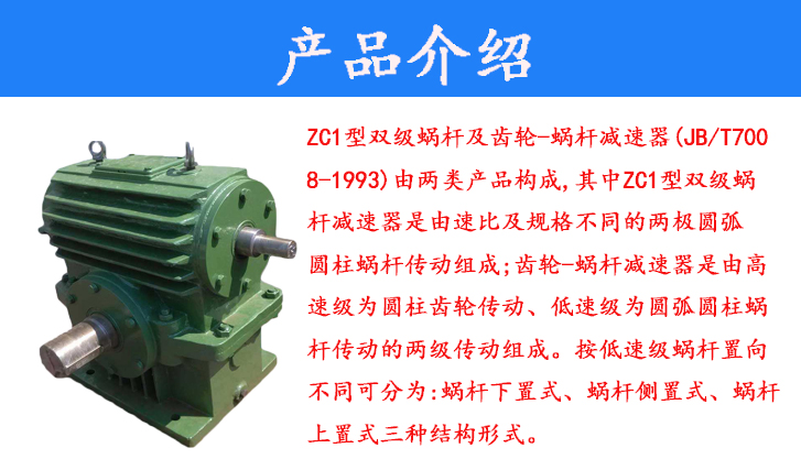 ZC1型雙級(jí)蝸桿及齒輪-蝸桿減速器(JB/T7008-1993)由兩類產(chǎn)品構(gòu)成,其中ZC1型雙級(jí)蝸桿減速器是由速比及規(guī)格不同的兩極圓弧圓柱蝸桿傳動(dòng)組成;齒輪-蝸桿減速器是由高速級(jí)為圓柱齒輪傳動(dòng)、低速級(jí)為圓弧圓柱蝸桿傳動(dòng)的兩級(jí)傳動(dòng)組成。