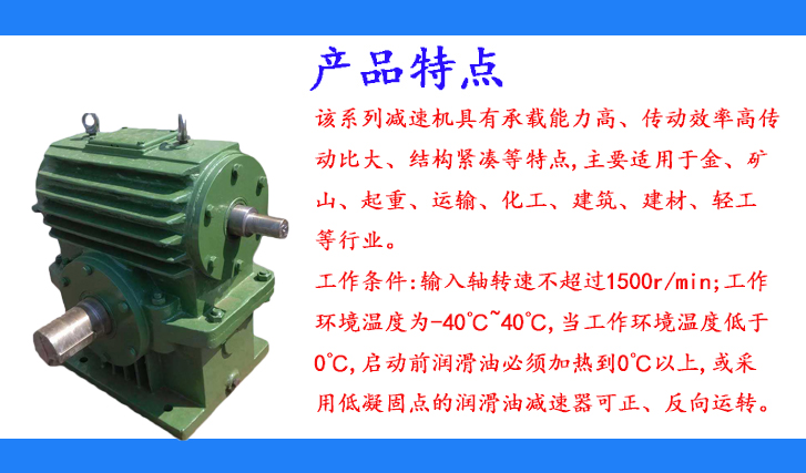 工作條件:輸入軸轉(zhuǎn)速不超過(guò)1500r/min;工作環(huán)境溫度為-40℃~40℃,當(dāng)工作環(huán)境溫度低于0℃,啟動(dòng)前潤(rùn)滑油必須加熱到0℃以上,或采用低凝固點(diǎn)的潤(rùn)滑油減速器可正、反向運(yùn)轉(zhuǎn)。