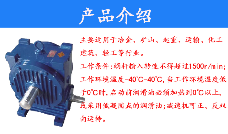 主要適用于冶金、礦山、起重、運輸、化工、建筑、輕工等行業(yè)。工作條件:蝸桿輸入轉速不超過1500r/min;工作環(huán)境溫度為-40~40℃,當工作環(huán)境溫度低于0℃時,啟動前潤滑油必須加熱到0℃以上,或采用低凝固點的潤滑油;減速器可正、反雙向運轉。