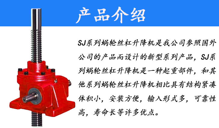 SJ系列蝸輪絲杠升降機(jī)是我公司參照國外公司的產(chǎn)品而設(shè)計(jì)的新型系列產(chǎn)品,該產(chǎn)品是一種起重部件,和其他系列蝸輪絲杠升降機(jī)相比具有結(jié)構(gòu)緊湊、體積小、安裝方便、輸入形式多、可靠性高、壽命長等許多優(yōu)點(diǎn)。