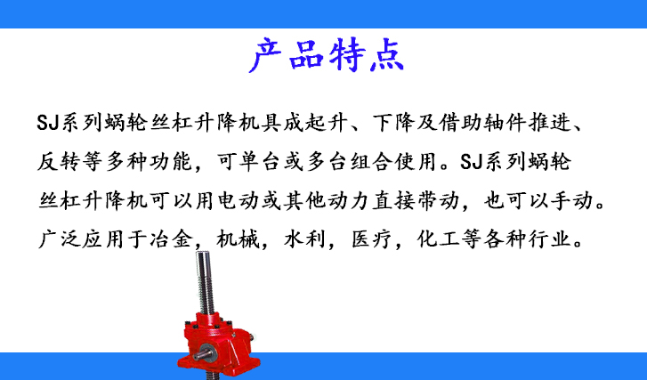 SJ系列蝸輪絲杠升降機(jī)具成起升、下降及借助軸件推進(jìn)、反轉(zhuǎn)等多種功能,可單臺或多臺組合使用。