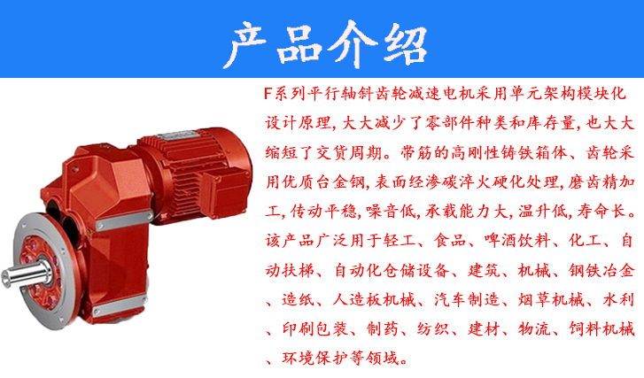 F系列平行軸斜齒輪減速電機(jī)采用單元架構(gòu)模塊化設(shè)計(jì)原理,大大減少了零部件種類(lèi)和庫(kù)存量,也大大縮短了交貨周期。帶筋的高剛性鑄鐵箱體、齒輪采用優(yōu)質(zhì)臺(tái)金鋼,表面經(jīng)滲碳淬火硬化處理,磨齒精加工,傳動(dòng)平穩(wěn),噪音低,承載能力大,溫升低,壽命長(zhǎng)。該產(chǎn)品廣泛用于輕工、食品、啤酒飲料、化工、自動(dòng)扶梯、自動(dòng)化倉(cāng)儲(chǔ)設(shè)備、建筑、機(jī)械、鋼鐵冶金、造紙、人造板機(jī)械、汽車(chē)制造、煙草機(jī)械、水利、印刷包裝、制藥、紡織、建材、物流、飼料機(jī)械、環(huán)境保護(hù)等領(lǐng)域。