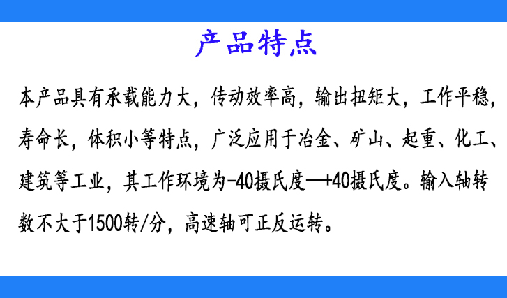 WH系列圓弧齒圓柱蝸桿減速器,符合部頒標(biāo)準(zhǔn)JB2318-79,達(dá)到標(biāo)準(zhǔn)化、系列化的要求適用于冶金、礦山、起重、運(yùn)輸、化工,建筑等各種機(jī)械設(shè)備的減速傳動(dòng)。本系列減速器輸入功率范圍在0.4-163KW之間,輸出扭矩在11-2600kgf.m之間,輸入軸轉(zhuǎn)數(shù)一般不大于1500轉(zhuǎn)/分,高速軸可正反兩向運(yùn)轉(zhuǎn);工作環(huán)境溫度為-40℃-45℃,當(dāng)工作環(huán)境溫度低于℃時(shí),起動(dòng)前潤滑油必須加溫到0℃以上