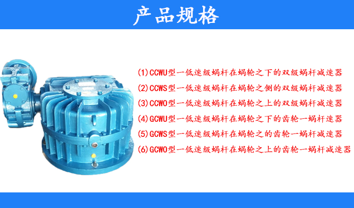 按低速級蝸桿置向不同可分為:蝸桿下置式、蝸桿側(cè)置式、蝸桿上置式三種結(jié)構(gòu)型式具有承載能力高、傳動效率高,傳動比大、結(jié)構(gòu)緊湊等特點