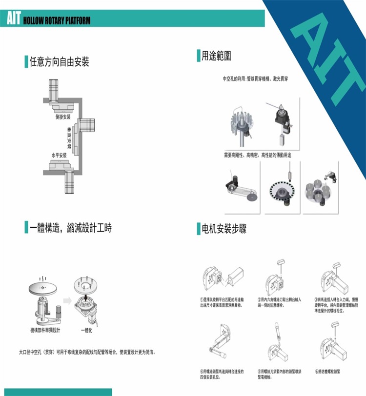 使用高剛性的交叉斜角滾子軸承與旋轉平臺面呈現(xiàn)一體化的設計,可承受大慣性的圓盤裝置,整組搭配步進馬達及驅動器。