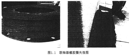 彈性聯(lián)軸器是應(yīng)用廣泛的機(jī)械零部件,在工業(yè)生產(chǎn),石油,化工,冶金等工業(yè)部門(mén)都有應(yīng)用,彈性聯(lián)軸器的使用狀況直接關(guān)系到機(jī)械設(shè)備的安全及壽命問(wèn)題,尤其是一些重要場(chǎng)合,彈性聯(lián)軸器的失效問(wèn)題往往引起人們的極大關(guān)注,例如某公司的GKZ型內(nèi)燃機(jī)車采用MTU16V396TC14型柴油機(jī)做內(nèi)燃機(jī)。MTU柴油機(jī)與風(fēng)扇偶合器采用萬(wàn)向軸來(lái)傳遞動(dòng)力。為了緩和沖擊力,柴油機(jī)輸出軸與萬(wàn)向軸聯(lián)接采用彈性聯(lián)軸器。0002#機(jī)車使用7年后,彈性聯(lián)軸器被剪斷,剪斷后的聯(lián)軸器如圖1.1所示。更換同種型號(hào)的彈性聯(lián)軸器后,使用未到一年又被剪斷,而同一型號(hào)的0001#,0003#機(jī)車使用時(shí)間以達(dá)9年,但彈性聯(lián)軸器依然完好如初。