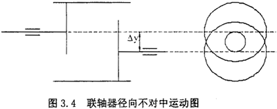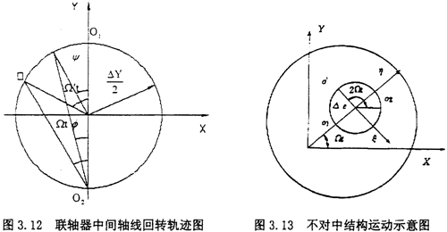 (2)當轉子軸線之間存在徑向位移時(如圖3.3所示),聯(lián)軸器的中間套齒與半聯(lián)軸器組成移動副,不能相對轉動,但是中間套齒與半聯(lián)軸器產生相對滑動而作平面圓周運動,即中間套齒的中心是沿著以徑向位移△y為直徑作圓周運動,如圖3.4所示。