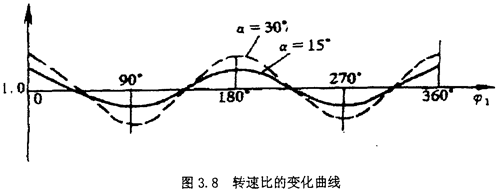 當主動轉子的回轉角速度為常數(shù)時,從動轉子的角速度是偏角和主動轉子轉角的函數(shù)。當或ф1=00或1800時,ω2最大,當ф2=900獲2700時,ω2最小。其轉速比變化曲線如圖3.8所示,即有ω1cosa≤ω2≤