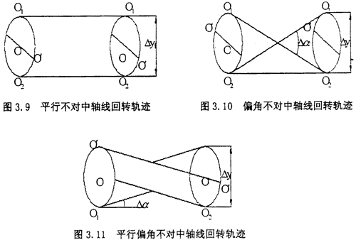 聯(lián)軸器連接的兩轉子軸線之間發(fā)生不對中故障時具有平行位移或角度位移,在運動傳遞過程中,聯(lián)軸器中間齒套的運動必須同時滿足兩半聯(lián)軸器的需要,即中間齒套軸線作平面運動,且軸心線的回轉運動頻率與轉子的運行頻率不一致。當產生平行不對中、偏角不對中和平行偏角不對中三種情況時,聯(lián)軸器中間齒套的軸線回轉軌跡分別為圖下圖所示的圓柱體、雙錐體和半雙錐體。在這些圖中,O1,O2為兩半聯(lián)軸器的軸心,O,O′為聯(lián)軸器中間套齒的靜態(tài)和動態(tài)回轉中心,△y,△α分別為轉子系統(tǒng)的平行和偏角不對中量。