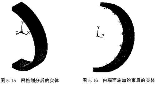 采用影射網(wǎng)格生成單元,Mesh Tool下設(shè)置面上網(wǎng)格尺寸的大小,橡膠圓環(huán)內(nèi)外端面的尺寸設(shè)為30,兩個截面尺寸設(shè)為5。在“Mesh”工具條下“Shape”下選擇“Hex”“Mapped”,單擊“Mesh”,在圖形屏幕上選擇實體。單擊“OK”,生成的網(wǎng)格單元如圖5.15所示