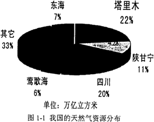 我國天然氣總資源量為3.8×1013m3。其中在面積為560,000km2的塔里木盆地,天然氣資源量就達(dá)8.39×l012m3。其中累計已探明地質(zhì)儲量4.19×l011m3,剩余可采儲量2.79×l011m3,是國內(nèi)天然氣資源量及剩余可采儲量最豐富的氣區(qū)。預(yù)計今后五至十年,累計探明地質(zhì)儲量可達(dá)1×1012m3。此外,從圖1-1可以看到,陜西、四川、青海等地的天然氣儲量也都十分可觀,氣田分布的西傾狀況比較明顯。