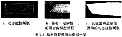 圖3-2顯示了DBF和DDF的形貌特征。從圖中看出動態(tài)延性斷裂相比于脆性斷裂具有速度較低,裂紋擴展途徑比較單一,能自行止裂等特點。由于脆性斷裂已被廣泛遏止,近二十年來,人們把注意力主要集中在延性斷裂的起裂擴展和止裂上,對延性斷裂的關(guān)注遠超過對脆性斷裂的研究,目前還遠未結(jié)束。管線鋼動態(tài)斷裂韌性的測定也就成為了人們關(guān)注的焦點。