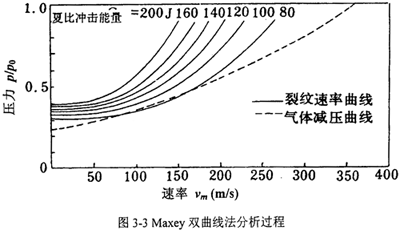 雙曲線法的具體分析過程如圖3-3所示,坐標(biāo)橫軸表示速度,縱軸表示氣體壓力或環(huán)向應(yīng)力。上方的一組曲線表征不同韌性水平下的斷裂速度,是內(nèi)壓或環(huán)向應(yīng)力的函數(shù)。隨著內(nèi)壓或環(huán)向應(yīng)力在斷裂過程中的減小,斷裂速度不斷降低。如果壓力或應(yīng)力足夠低,斷裂速度即減小到零而發(fā)生止裂。