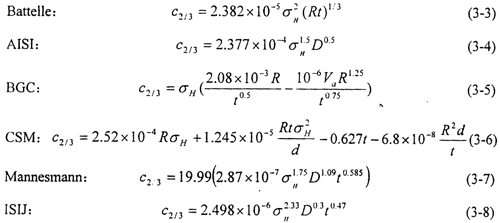 在雙曲線法的基礎(chǔ)上,結(jié)合大量的實驗結(jié)果對止裂韌性進行標(biāo)定,世界各大研究機構(gòu)分別給出了簡便易算的經(jīng)驗公式用以估算臨界止裂韌性,列舉如下:
