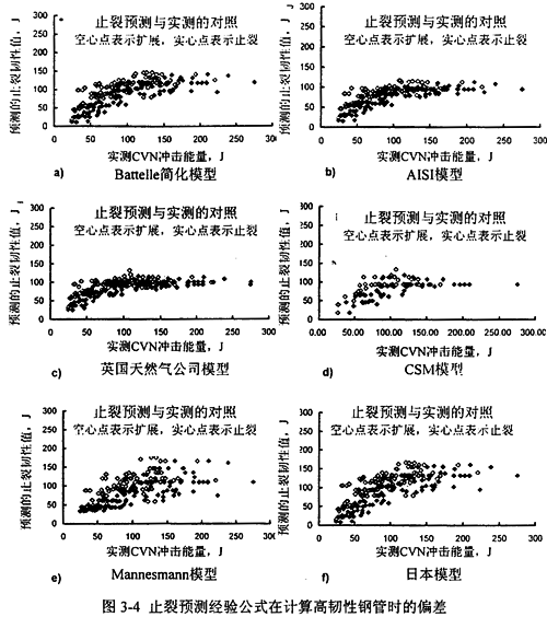 圖3-4表示了Battelle應(yīng)用Maxey雙曲線法對全尺寸實驗數(shù)據(jù)庫所做的DDF止裂韌性預(yù)測,圖3-4a至圖3-4f分別對應(yīng)于式(3-3)至式(3-8)。圖中顯示的實驗用管的鋼級包括X52到Xl00,管徑范圍從4O6mm到1422mm,實驗最高壓力超過16MPa?梢,預(yù)測模型在管材韌性低于某一水平時預(yù)測結(jié)果與實物實驗結(jié)果基本吻合,但當(dāng)管材韌性較高時出現(xiàn)明顯偏差,預(yù)測應(yīng)該止裂的管線沒有止裂。經(jīng)典的止裂預(yù)測模型在預(yù)測夏比能量值高于94J的管材時,已經(jīng)偏于危險,即過高估計了管材的止裂性能。