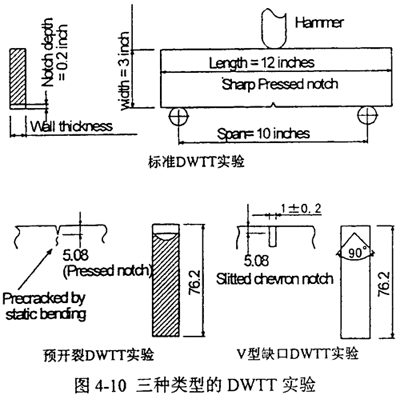 實驗證實,對有上臺能的控軋鋼進行的實驗中,標準DWTT實驗比夏比沖擊實驗在評價延性裂紋擴展行為上有更好的對應關系。但對于高韌性的淬火回火鋼,標準DWTT試樣由于在起裂過程中吸收了大量的功,致使裂紋擴展的應變速度過低而與真實擴展狀況不符。采用靜態(tài)預制裂紋DWTT試樣或雙試樣DWTT法是解決這一問題的兩種方案,如圖4-10所示。