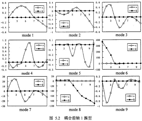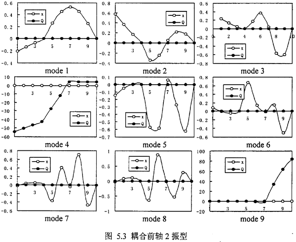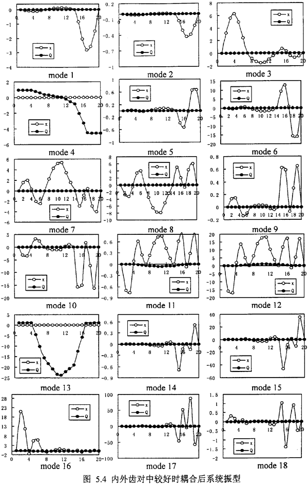 但是,另外我們可以發(fā)現(xiàn),在表5.3中出現(xiàn)了許多表5.1和表5.2中所沒有的新的固有頻率如λ4co,λ7co,λ8co,λ11co,λ12co,λ13co,觀察這些因有頻率所對應的振型,可以發(fā)現(xiàn),它們對應又可分為三種,1.純的彎曲耦合振型λ7co,λ8co對應振型圖5.4中mode7、8;2.純的扭轉耦合振型λ4co,λ13co對應振型圖5.4中mode4、13;3.彎扭振型相迭加的復振型——彎扭耦合振型λ11co,λ12co對應振型圖5.4中mode11、12。這種彎耦合振型是由于齒輪聯(lián)軸器的耦合作用而新產生的,這是齒輪軸系統(tǒng)區(qū)別于一般單轉子系統(tǒng)的重要特征之一,由于彎扭耦合模態(tài)的產生,決定了軸系統(tǒng)的振動是彎扭耦合振動。