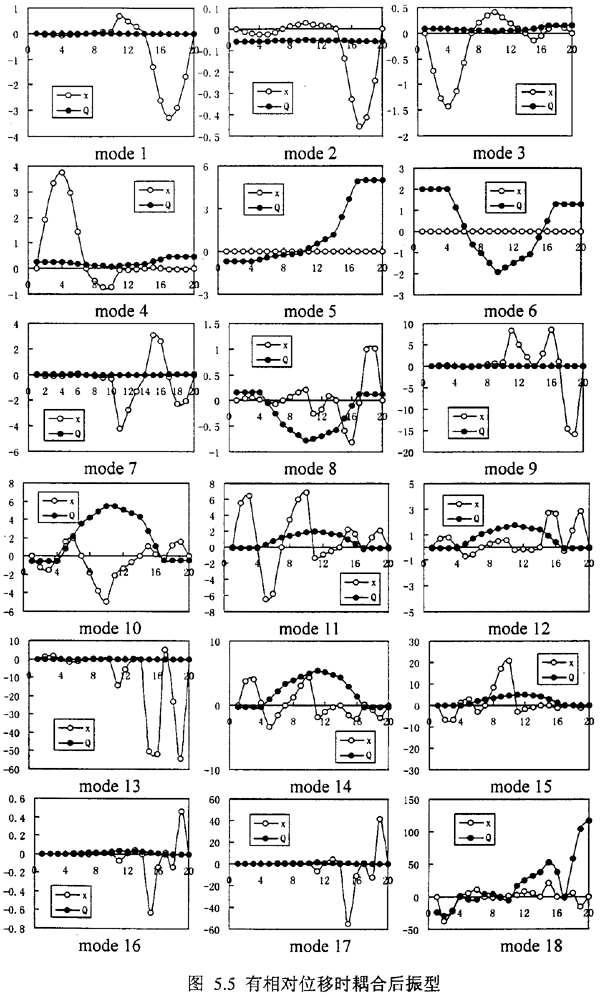 表5.3是耦合系統(tǒng)在同樣的轉速下,前18階的固有頻率,圖5.4是這些固有頻率對應的耦合狀態(tài)下轉子的振型;橫坐標質點1~10代表軸1、11~20代表軸2;縱坐標為振型;實點表示扭轉振型、空心點表示彎曲振型。