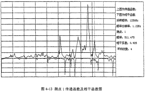 圖4-13是測點1垂直方向的傳遞函數(shù)及相干函數(shù)圖,其它點的傳遞函數(shù)圖由于篇幅關(guān)系省略。
