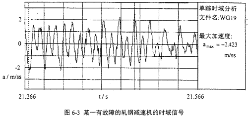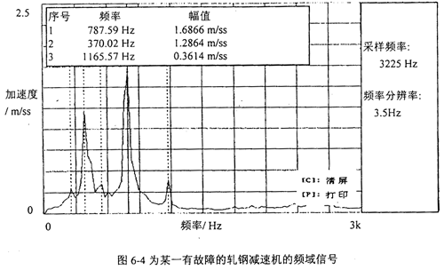 由于減速機故障樣式的多樣性,故它的故障標準模式樣本的建立是比較困難的,需進行大量的試驗研究和實際設備故障診斷的總結(jié)和歸納。表6-5是在參考其它學者研究成果的基礎上,總結(jié)設備具體工作情況得出的減速機的故障標準模式樣本,表6-6為減速機標準訓練樣本的訓練結(jié)果(網(wǎng)絡規(guī)模為:輸入層節(jié)點數(shù)為:9個;一個隱層節(jié)點數(shù)為:40個;輸出層節(jié)點數(shù)為9個;誤差精度為10-5,網(wǎng)絡迭代次數(shù)為5217次)。圖6-3為某一有故障的軋鋼減速機的時域信號,圖6-4為頻域信號。對圖6-4的頻域信號進行歸一化處理,可得待識別的故障樣本,用訓練好的網(wǎng)絡對該樣本進行識別。表6-7為該減速機故障樣本的識別結(jié)果。fa一軸頻,f0一軸承外圈故障特征頻率,fi一軸承內(nèi)圈故障特征頻率,fb一軸承滾動體故障特征頻率,fmeh一齒輪嚙合頻率。