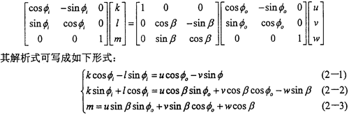 如圖2-21所示,坐標(biāo)系OXjYjZj可以看作是坐標(biāo)系OXiYiZi繞Xi(或Xj)旋轉(zhuǎn)了一個(gè)角β度。旋轉(zhuǎn)的方向余弦矩陣為: