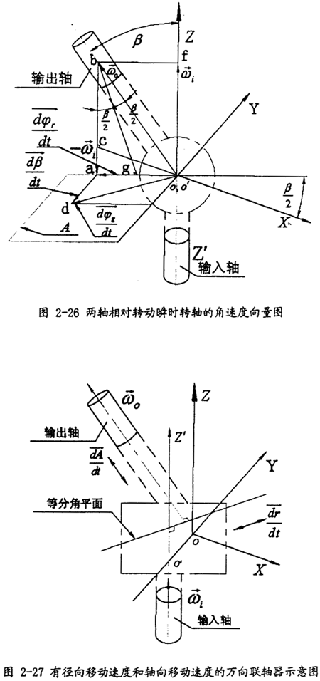 所以軸線相交的等角速萬向聯(lián)軸器輸出軸相對于輸入軸的相對轉(zhuǎn)動瞬時轉(zhuǎn)軸始終位于兩軸的等分角平面內(nèi)?紤]到萬向聯(lián)軸器的一般情形:輸入軸與輸出軸軸線并不位于同一平面內(nèi),存在與輸入軸線和輸出軸線垂直的徑向位移,且有徑向移動速度和軸向移動速度