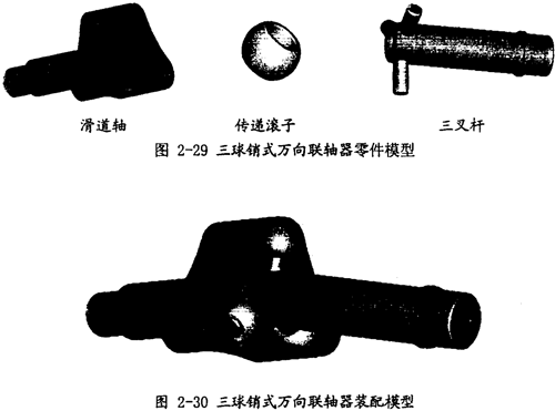 三球銷式萬向聯(lián)軸器是一種被廣泛應(yīng)用的聯(lián)軸器,已有近30年的歷史,它同后面敘述的兩種聯(lián)軸器同屬三叉式萬向聯(lián)軸器,它們的傳動原理在本文的第三章中有詳細(xì)的描述,是一種運動規(guī)律十分復(fù)雜的聯(lián)軸器。它的裝配模型和零部件模型分別如圖2-30、圖2-29所示.在聯(lián)軸器轉(zhuǎn)動時,傳遞滾子既可相對滑道軸中的滑道軸向移動,也可沿三叉桿的軸頸轉(zhuǎn)動和徑向移動,以補償兩軸夾角的變化。