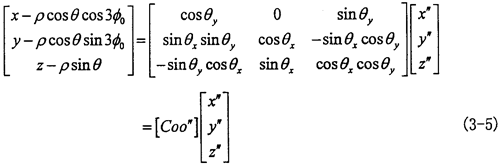 由于動(dòng)坐標(biāo)系O″X″Y″Z″的O″Y″軸取得始終垂直于固定坐標(biāo)系OX軸,可認(rèn)為先把OXYZ坐標(biāo)系繞OX軸轉(zhuǎn)過夾角θx,使OY軸與O″Y″軸平行,再繞新的OY軸轉(zhuǎn)過θy,使OX軸與O″X″軸平行,OZ軸也同時(shí)平行于O″Z″軸(變換空間位置如圖3-6所示)。則固定坐標(biāo)OXYZ與動(dòng)坐標(biāo)系間的變換關(guān)系如下: