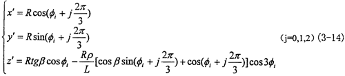 在定坐標(biāo)系O′X′Y′Z′中輸入軸的三滑道軸線m1、m2、m3方程為: