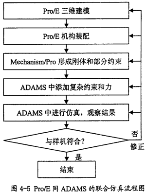 在仿真中如果發(fā)現(xiàn)結(jié)果不對(duì),則我們需要對(duì)前面的模型進(jìn)行修正,然后再做仿真分析,直到結(jié)果正確。總而言之利用Pro/E和ADAMS進(jìn)行聯(lián)合仿真,其基本的步驟如圖4-5所示。