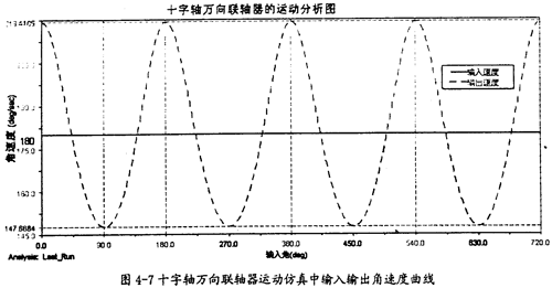 由圖4-6可知,仿真中十字軸萬(wàn)向聯(lián)軸器的兩軸夾角實(shí)際上即是34.88°(原夾角的補(bǔ)角),在第二章的十字軸萬(wàn)向聯(lián)軸器理論計(jì)算曲線(xiàn)圖中也包含了這個(gè)夾角下的運(yùn)動(dòng)分析曲線(xiàn)(圖2-12),比較圖2-12中β=34.88°的曲線(xiàn)和圖4-7的曲線(xiàn),可知兩條曲線(xiàn)在變化頻率、形狀、值的大小都是一樣的。