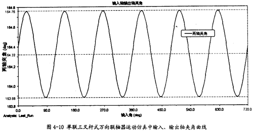 由圖4-10可以知道,輸入軸同輸出軸的夾角在三叉桿式萬向聯(lián)軸器運轉(zhuǎn)時是不斷變化的,在每一個回轉(zhuǎn)周期中,它的變化頻率為3次,這證明了這種聯(lián)軸器是一種非定心式萬向聯(lián)軸器,同時在一定的程度上驗證了三叉桿式三軸頸的交點以三倍于萬向聯(lián)軸器的轉(zhuǎn)速作圓周運動的理論的正確性。另外還可看出盡管夾角在不斷變化,但變化非常小,對兩軸的夾角大小影響很小,本次仿真中夾角大小平均是164.32°(其補角為15.7°,即是第三章中理論計算中的角度之一)。