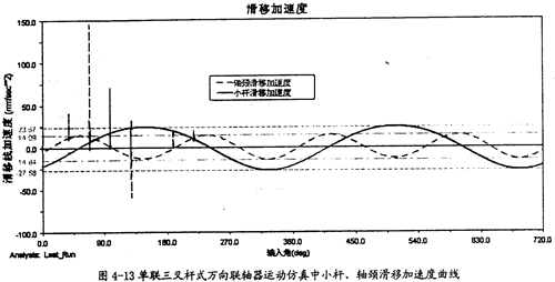 由圖4-13可以知道,在一定的夾角下,小桿在滑道中有滑移加速度同小桿球面中心相對軸頸的滑移加速度是不同的,前者要大于后者,且它們變動的頻率也不一樣,在一個回轉(zhuǎn)周期中,前頻率是1次,而后者2次。此圖中的兩曲線同第三章中的理論分析曲線圖3-13、圖3-14是吻合的,只是小桿滑移的加速度曲線在外形上有差異,仿真的曲線相當?shù)钠交⒁?guī)則,但理論分析曲線卻不規(guī)則,這可能是在計算中簡化和省略的原因。盡管如下,這在一定的程度上也證明了三叉桿式萬向聯(lián)軸器理論分析中對小桿滑移加速度和軸頸滑移加速度這兩項計算的正確性。(值得說明的是此圖中曲線有時有突變的現(xiàn)象,主要是考慮到計算機的性能,計算中步長稍大的原故。在后面的分析曲線中也出現(xiàn)了這樣的情況,將不再作說明。)